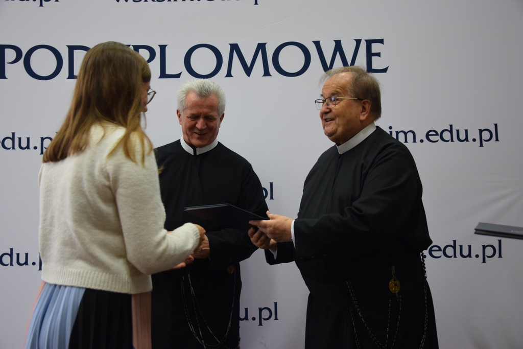 Uroczyste wręczenie indeksów przez rektora WSKSiM o. dr Zdzisława Klafkę w sobotę 27 października słuchaczom studiów podyplomowych „Polityka gospodarcza, finanse i bankowość” oznaczało rozpoczęcie ich kształcenia w naszej Uczelni.